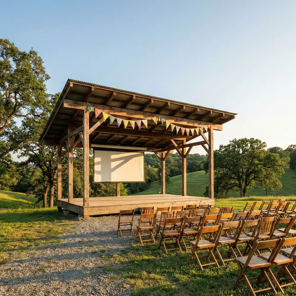 An open‑air pavilion with a covered stage and movable seating, set in a hillside park for fairs and seasonal shows.